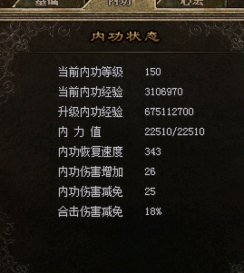 获得内功心法之后,需要不断消灭具有内功的怪物才能提升自己的内功等级,从而达成学习内功增强技能的条件。内功等级提升之后,内力对于普通攻防的补助效果也将得到不断强化。同时,内功等级也是内功系统将来发展所必需的条件。目前内功等级上限为350级
